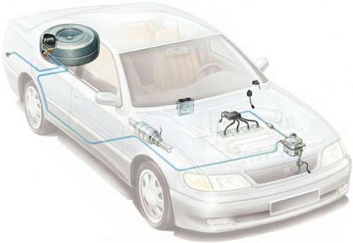 U zadnjem dijelu vozila nalazi se spremnik (na kojem se nalazi multiventil i kutija multiventila), te priključak za vanjsko punjenje koji je, sukladno s novim zakonom, obavezno smješten s vanjske strane automobila, dakle na braniku, ispod branika ili je smješteno tamo gdje ulijevate i benzinsko gorivo. U prednjem dijelu automobila se nalazi isparivač, elektromagnetni ventil za plin, plinsko računalo i plinske brizgaljke (dizne), senzori i filteri plina. Plinskih spremnika postoje dva oblika; toroidalni (umjesto rezervnog kotača) i cilindrični. Spremnici se mogu postaviti tamo gdje ima prostora za njih, ali da budu postavljeni sukladno s novim zakonom. Veličina spremnika se proteže od 45 l do 120 l za cilindrične, te 22 l do 70 l za toroidalne spremnike, s time da u svaki spremnik stane 80% njegovog stvarnog volumena. Dakle u 100 litarski spremnik stane 80 l plina. Bez najmodernije tehnologije i računala nema zanata. Da bi automobil uopće mogao raditi na plin potreban je, uz svu tu tehnologiju, i software, i dobro poznavanje kompjutera i kompjuterskih aplikacija.